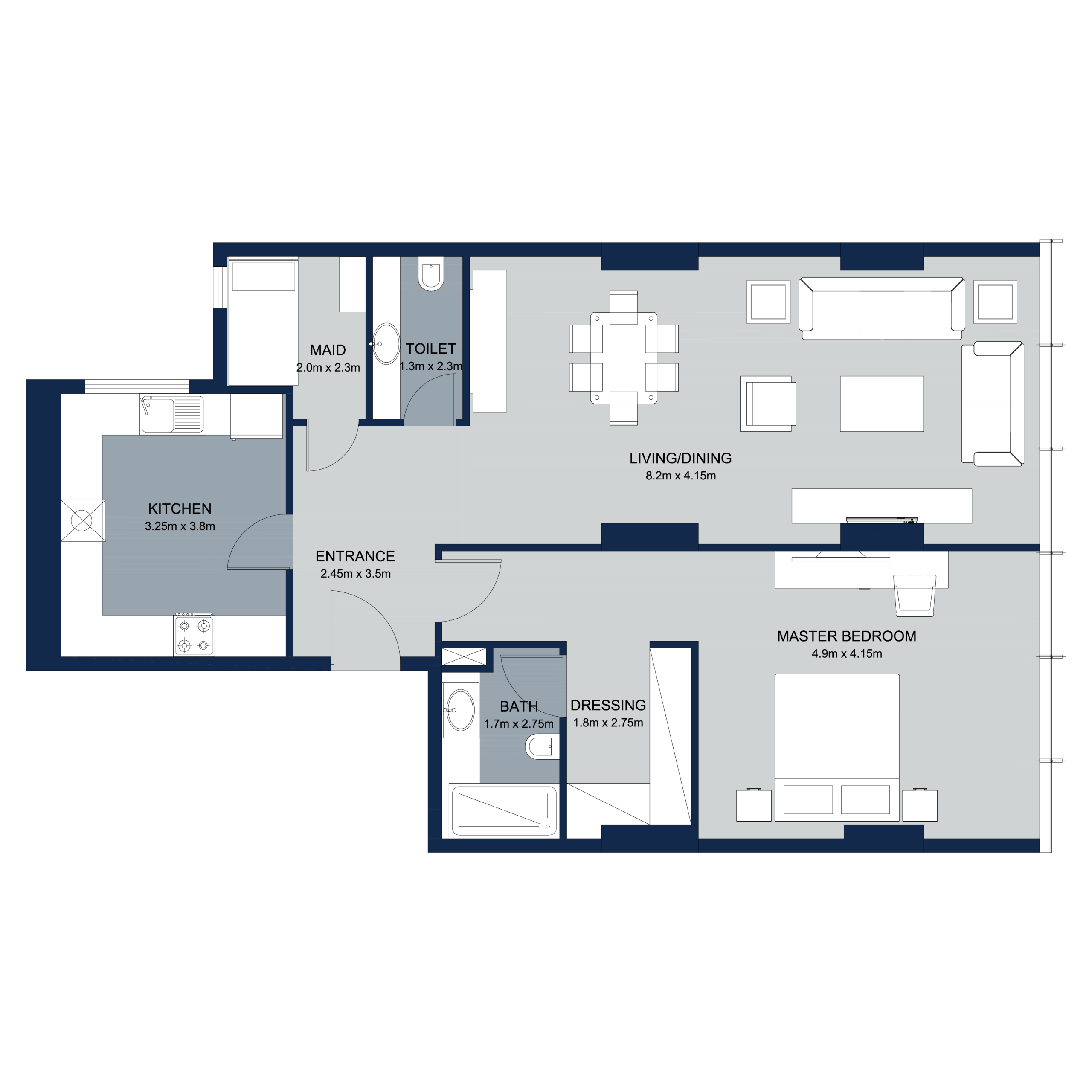 La Plage Tower has 45 floors in total, with 350 residential apartments ranging from  1, 2 and 3 bedrooms plus duplex apartments. Some of these units are built with large terraces. It also holds 2 commercial shops and 17 office spaces. Tower amenities include spacious parking slots, swimming pool for both kids and adults, separate gym for gents and ladies furnished with new and modern equipment. The tower is equipped with 24/7 security staff to monitor safety of the premises and its residents.