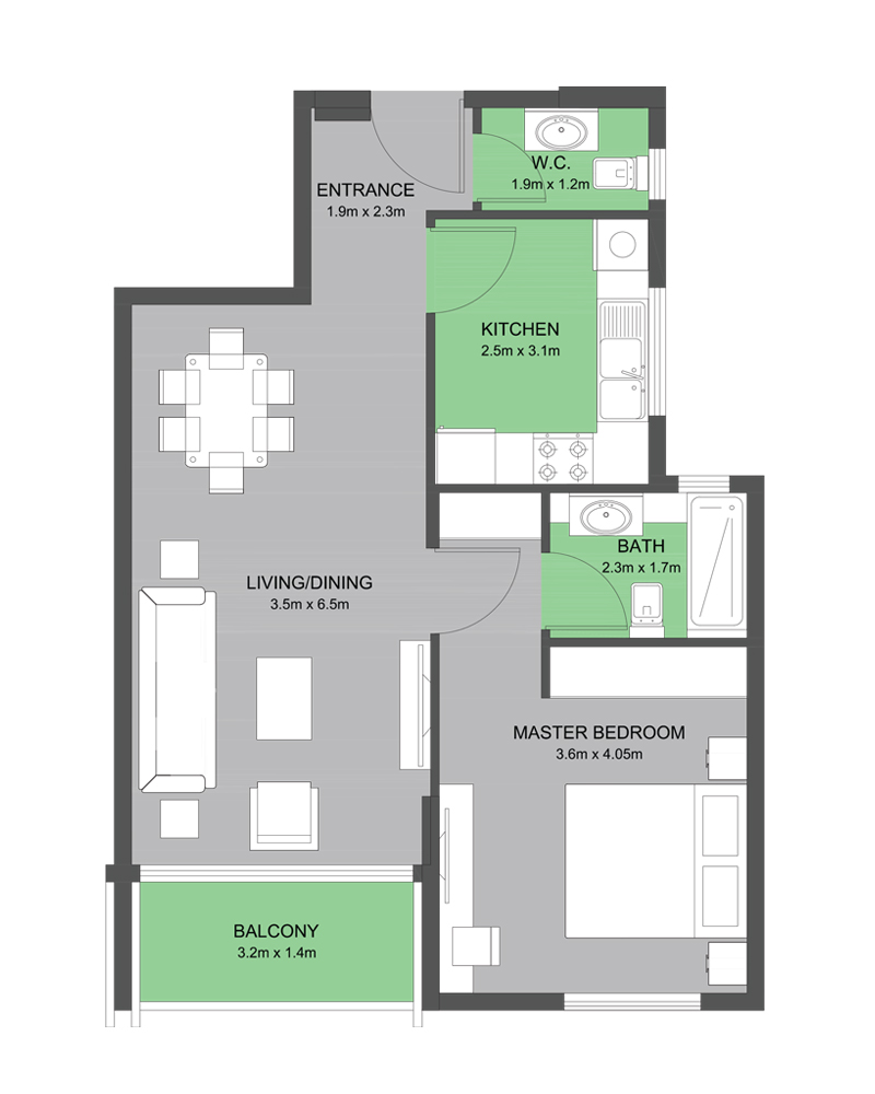 The Type A-6 floor plan at Muweileh Community offers a modern 1 bedroom apartment in Sharjah, ideal for students, academics, and young professionals near University City. With a 910 sq. ft. layout, it combines a bright living/dining area opening to the balcony, a separate kitchen with guest W.C., and a comfortable master bedroom with attached bath, all within a community that also offers retail, study spaces, a rooftop pool, and separate gyms for men and women.