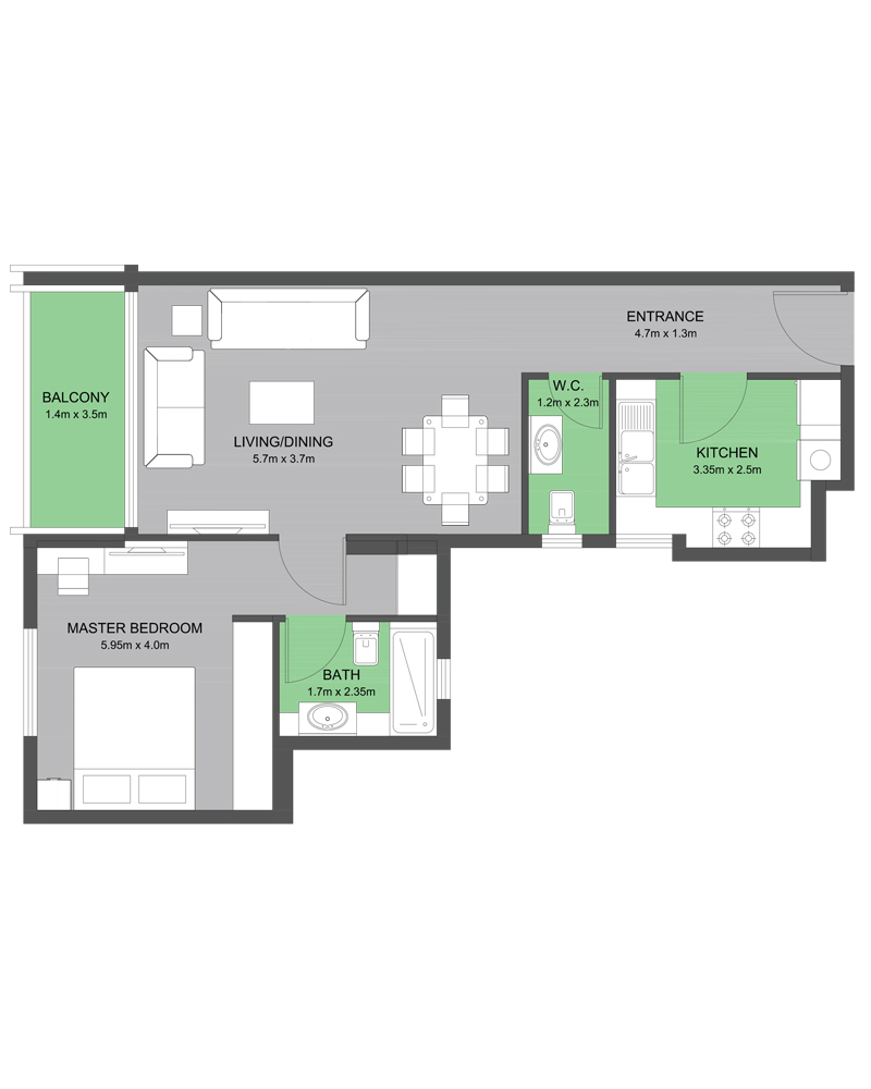 Spacious 1-bedroom apartment in Muweileh Community, Sharjah, ideal for students, academics, and young professionals near University City. The Type A-4 layout offers 930 sq ft with an extended living/dining area opening to the balcony, a separate kitchen with guest W.C., and a private master bedroom with attached bath, all set within a community that also offers retail, study spaces, a rooftop pool, and separate gyms for men and women.
