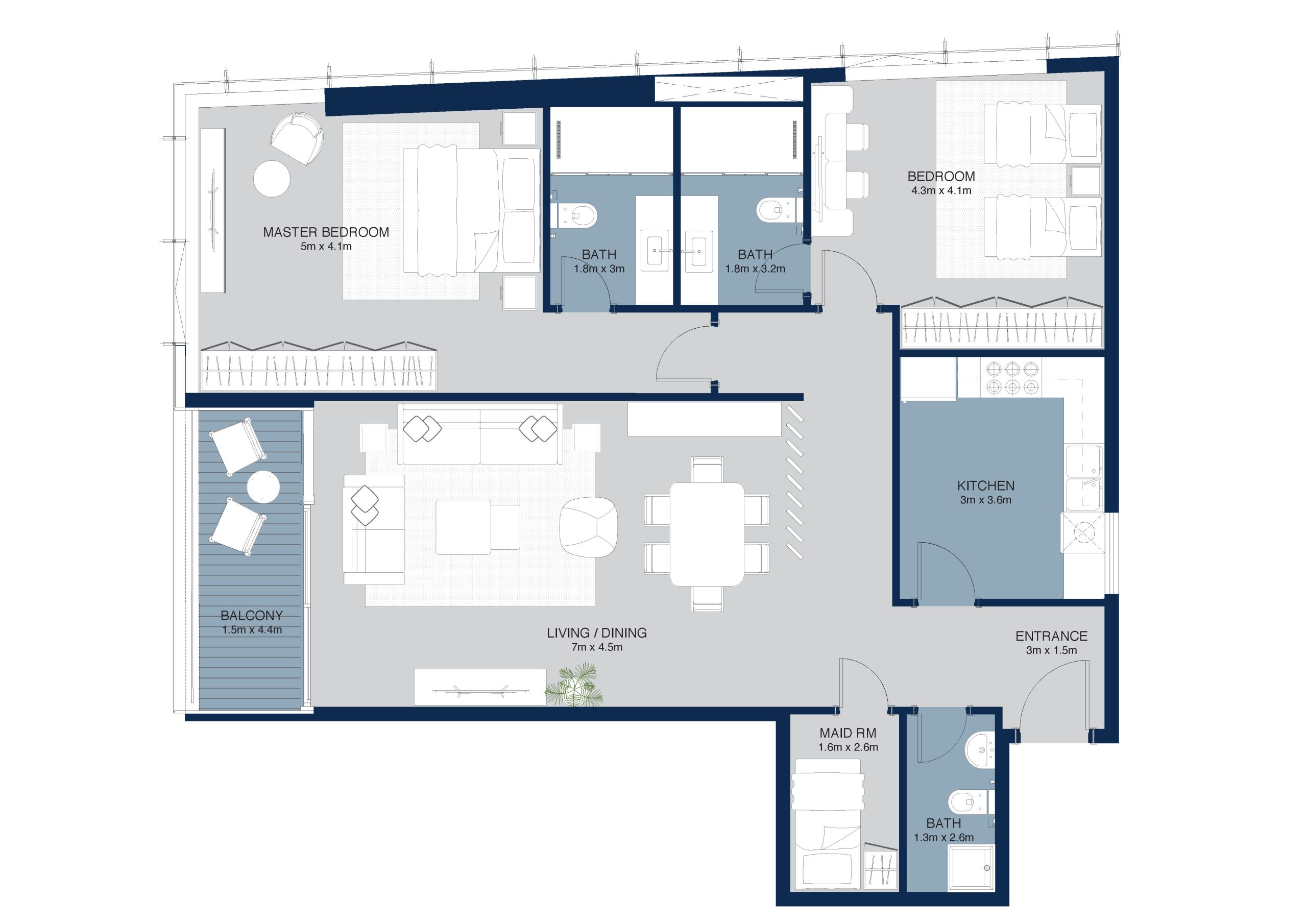 The 2-bedroom apartment (33rd – 45th floors) blends modern practicality with beachside tranquility, offering generous storage, sleek fittings, and a light-filled living space ideal for entertaining or unwinding.