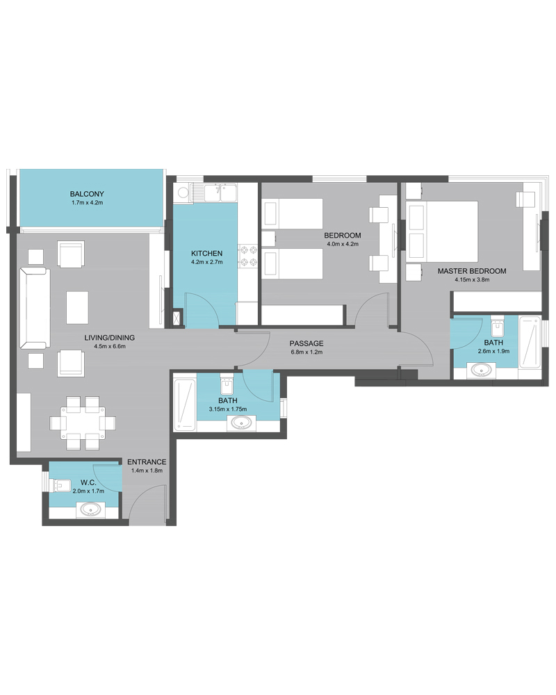 The Type B-4 floor plan at Muweileh Community offers a spacious 2 bedroom apartment in Sharjah, ideal for families who want a comfortable home close to University City. With 1,550 sq. ft., it features a large living/dining area opening to the balcony, a separate kitchen near the entrance, a long passage leading to two well-sized bedrooms, two bathrooms plus a guest W.C., all within a building that provides 24/7 security and maintenance, parking, and separate ladies’ and gents’ gym facilities.