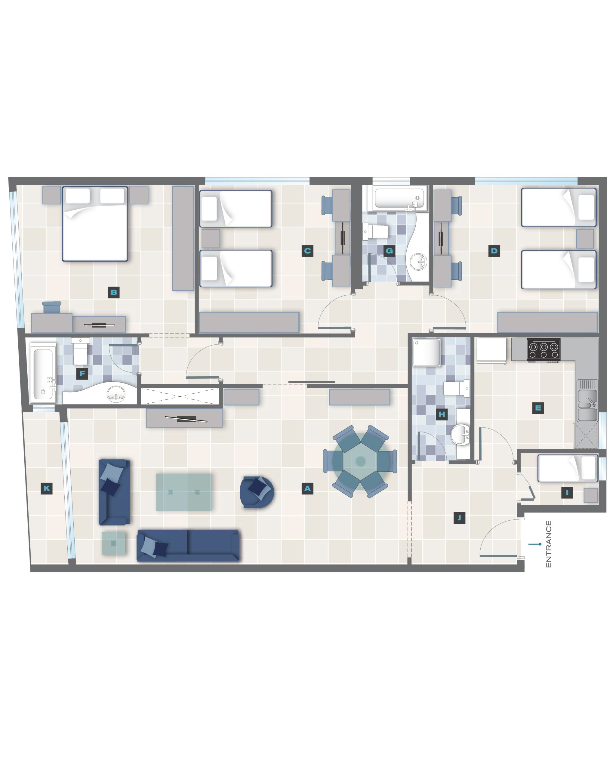 Discover this expansive three-bedroom apartment, showcased in a detailed 3 bedroom floor plan perfect for a large family apartment or shared living arrangement. As a rare and highly desirable 3 bed 4 bath apartment, this spacious apartment layout offers unparalleled comfort and privacy. The heart of this modern 3 BHK flat design is the vast open concept living space, which includes access to a large apartment with balcony and serves as the central hub for family life. This premium condo floor plan features a secluded master bedroom with en-suite, two generously-sized secondary bedrooms, and the significant advantage of a separate guest powder room, making it an exceptional property that accommodates every need.