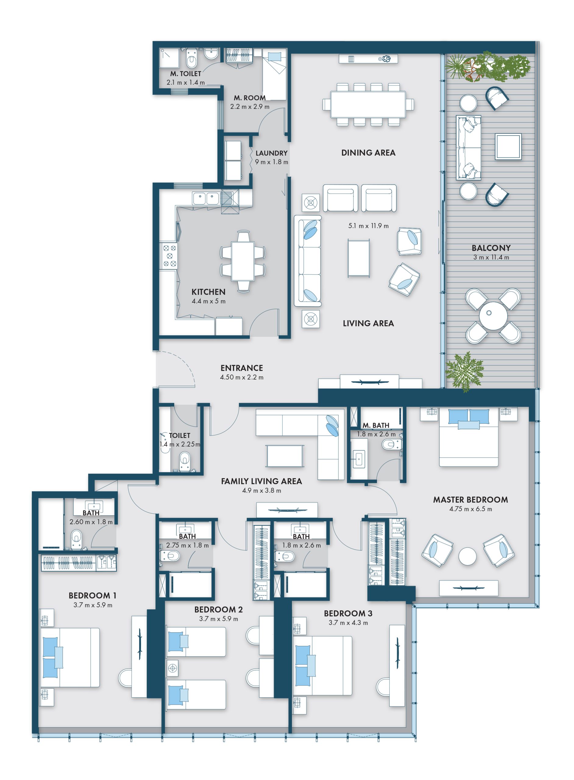 The Type 1 floor plan at Almaza Tower offers a stunning 4 bedroom apartment in Sharjah, designed for families who want maximum comfort, privacy and luxury. With a generous 4,175 sq. ft. layout, this residence combines spacious interiors, multiple living areas and a large balcony overlooking the Al Khan waterfront.