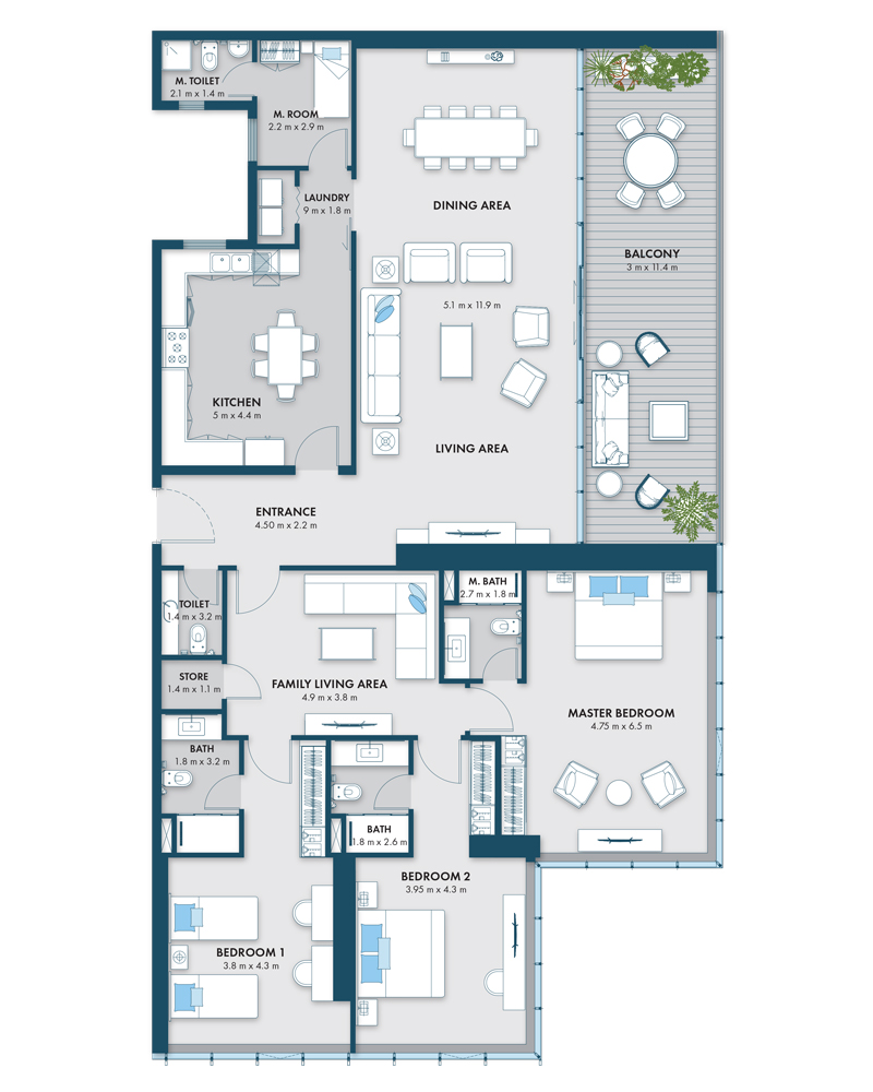 The Type 1 floor plan at Almaza Tower offers a beautifully designed 3 bedroom apartment in Sharjah, combining modern layouts with elegant finishes. With expansive living areas and a generous balcony, this residence is ideal for families looking for a luxury apartment in Sharjah’s Al Khan waterfront community.