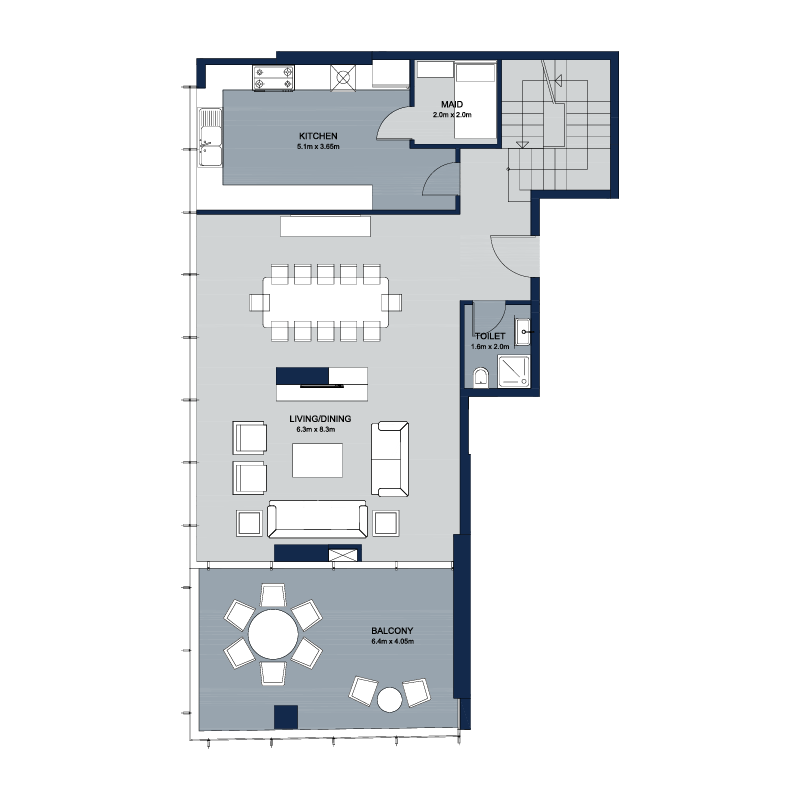 La Plage Tower has 45 floors in total, with 350 residential apartments ranging from  1, 2 and 3 bedrooms plus duplex apartments. Some of these units are built with large terraces. It also holds 2 commercial shops and 17 office spaces. Tower amenities include spacious parking slots, swimming pool for both kids and adults, separate gym for gents and ladies furnished with new and modern equipment. The tower is equipped with 24/7 security staff to monitor safety of the premises and its residents.