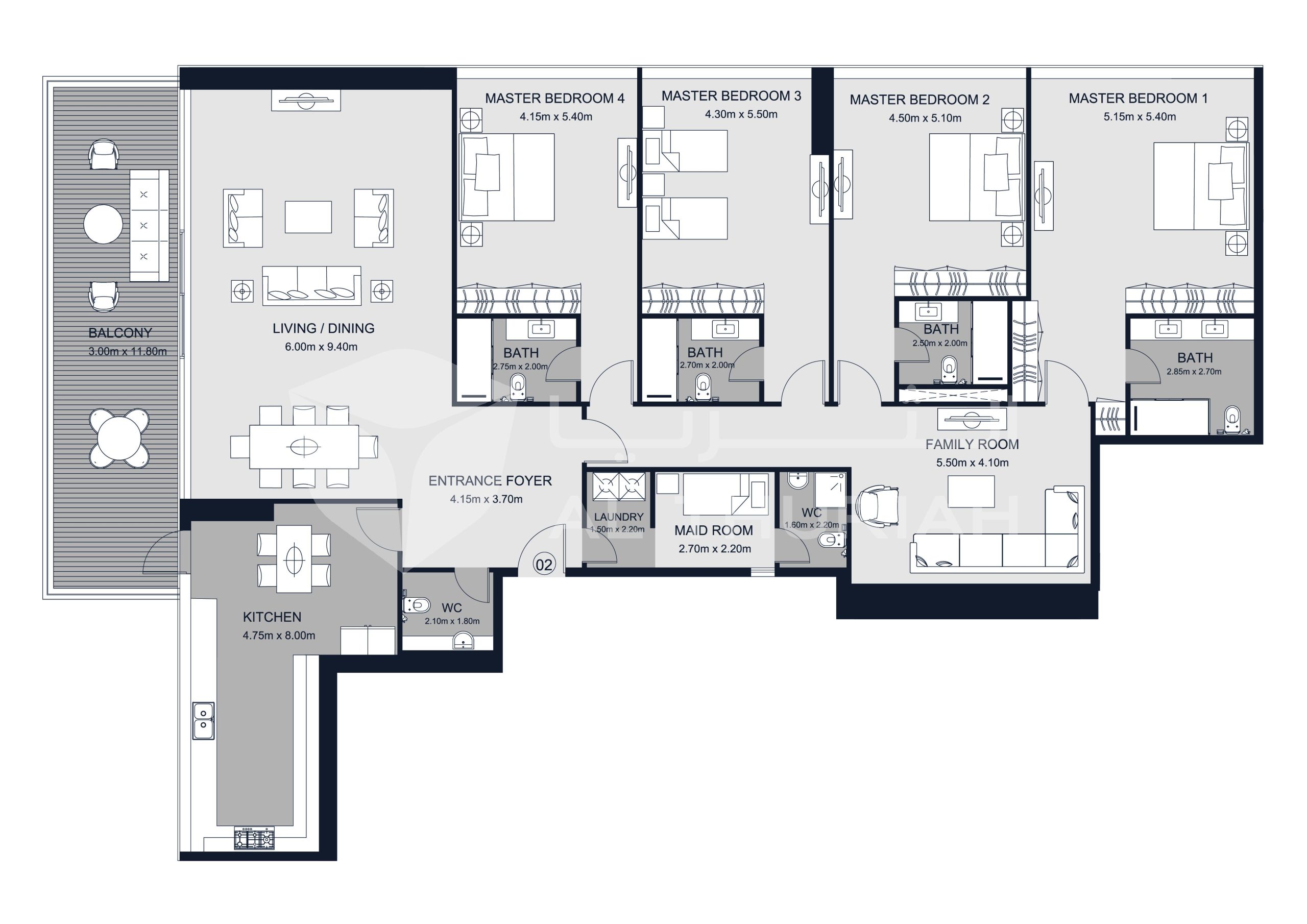 The Type 2 floor plan at Sharjah Terraces offers a stunning 4 bedroom luxury apartment in Sharjah, designed for families seeking space, comfort, and modern elegance. With a total area of over 4,485 sq. ft., this residence delivers expansive living areas, private suites, and direct access to the vibrant Al Khan waterfront community.