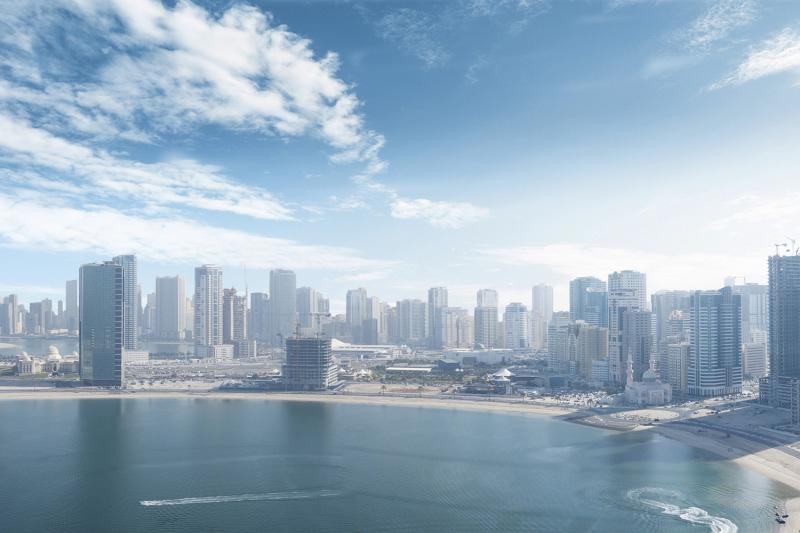 This mesmerizing residential tower is located in-between Dubai and Sharjah. Infront highlights the beachfront of Al Mamzar area.